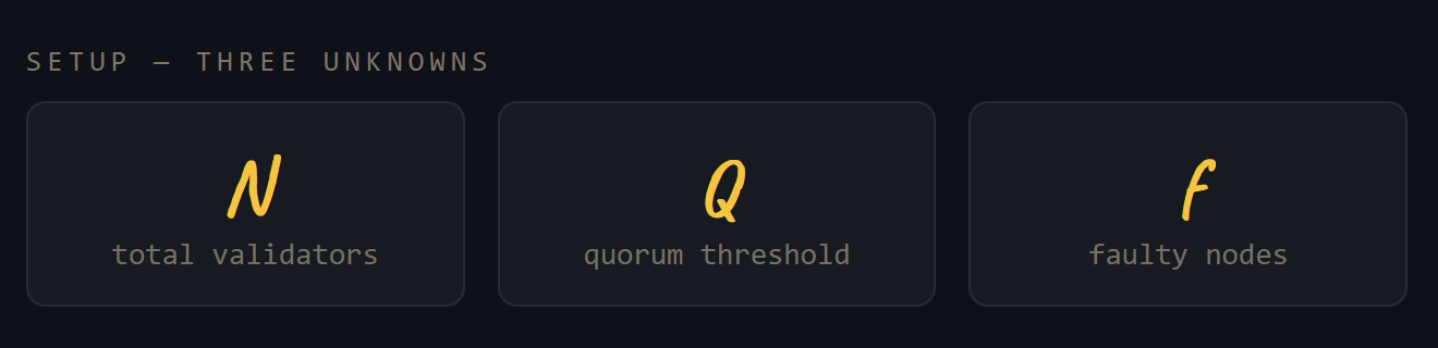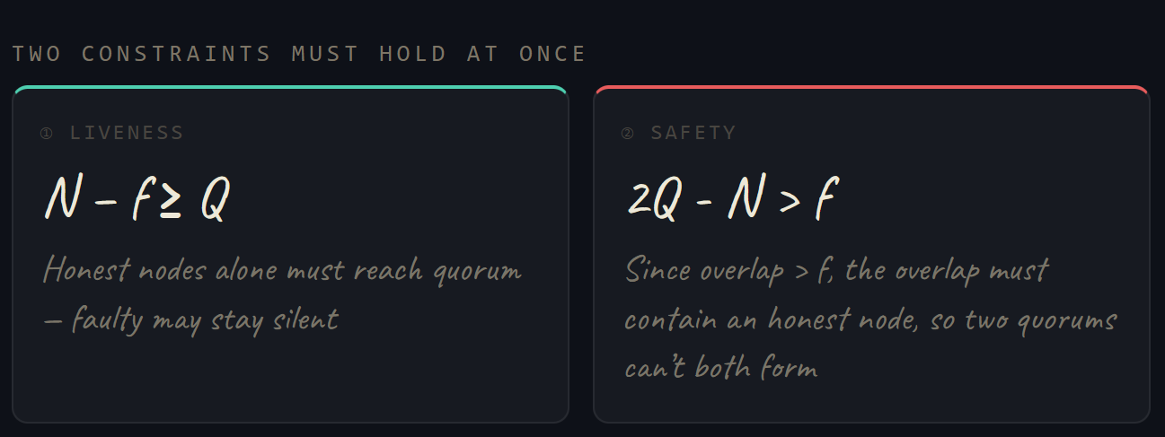 2Q- two quorums;2Q > N- when two quorums overlap, their total count is greater than the total number of nodes;2Q-N = overlap- the count of overlapped nodes is the difference between2QandN;overlap > fis needed for safety because there must NOT be honest nodes in the overlap;- therefore,