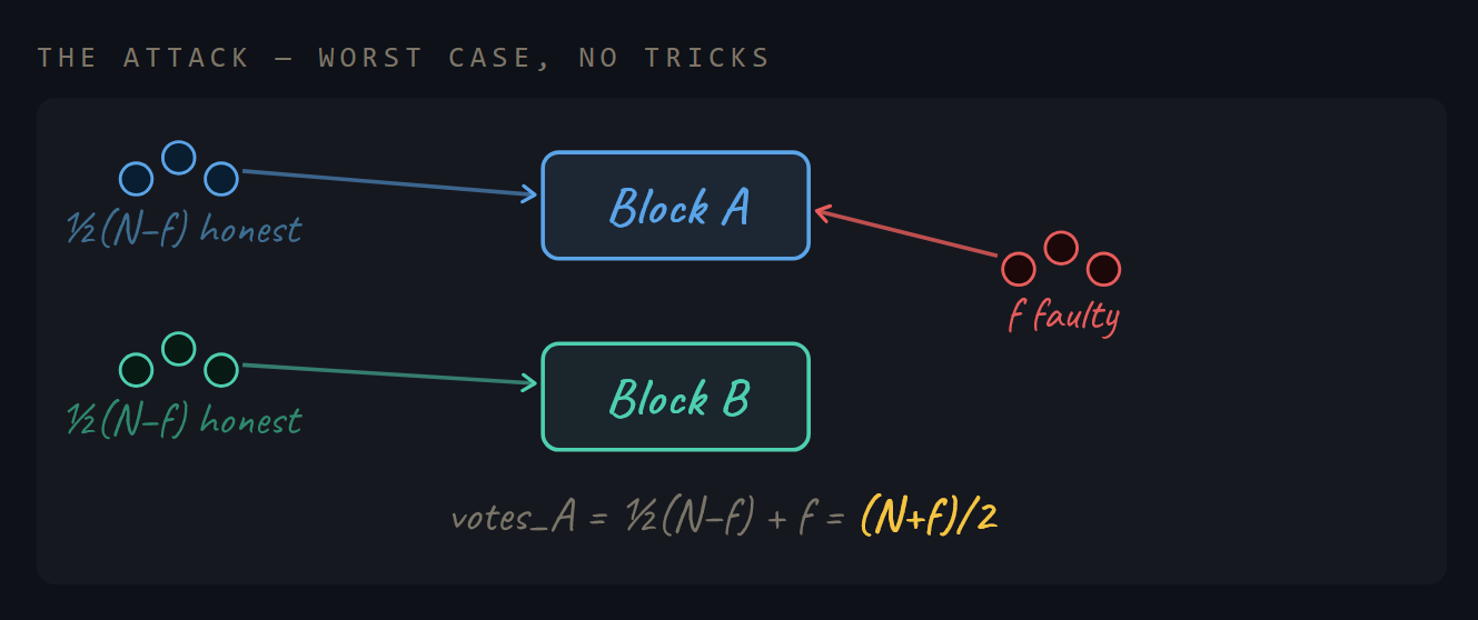 Byzantine nodes don't reveal themselves β they all pile onto A, silently voting with(N-f)/2 + f = (N+f)/2.