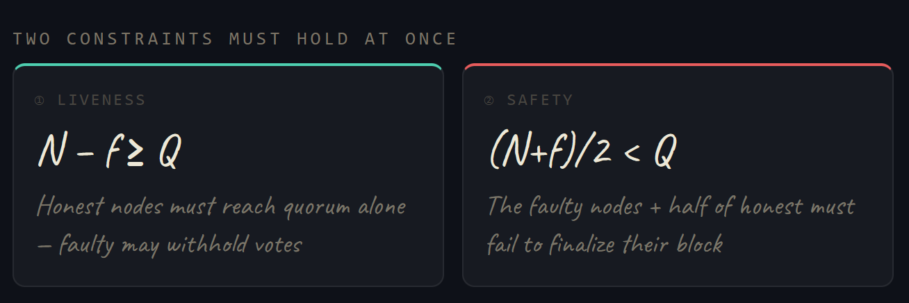 So, if there are f faulty nodes, we need a system that can still reach quorum Q out of N total nodes to agree on a new state (a block). It's liveness.