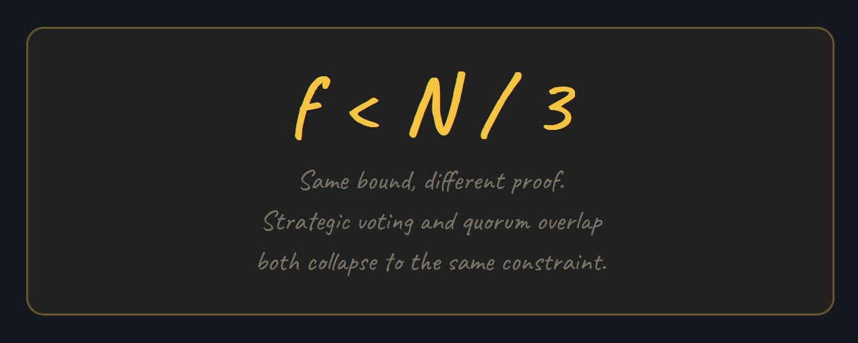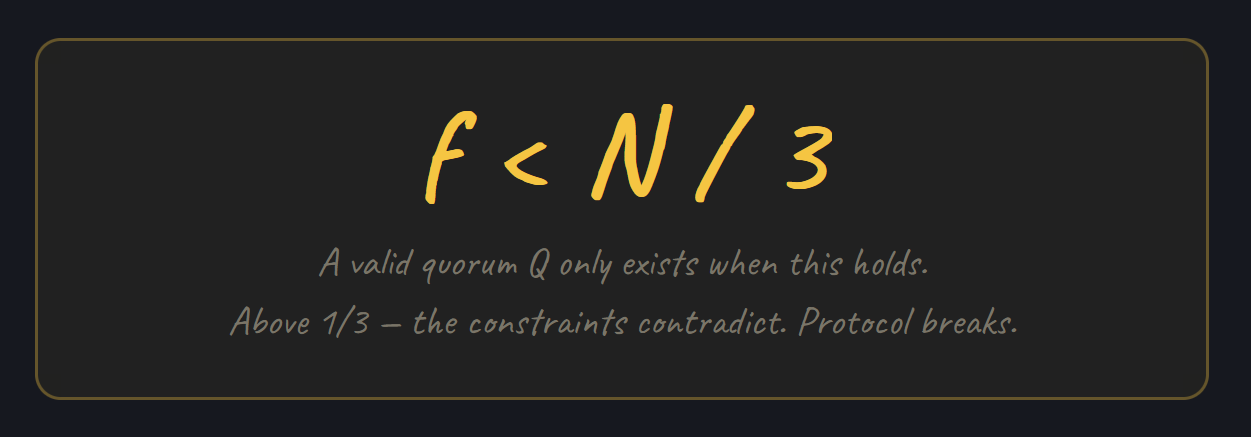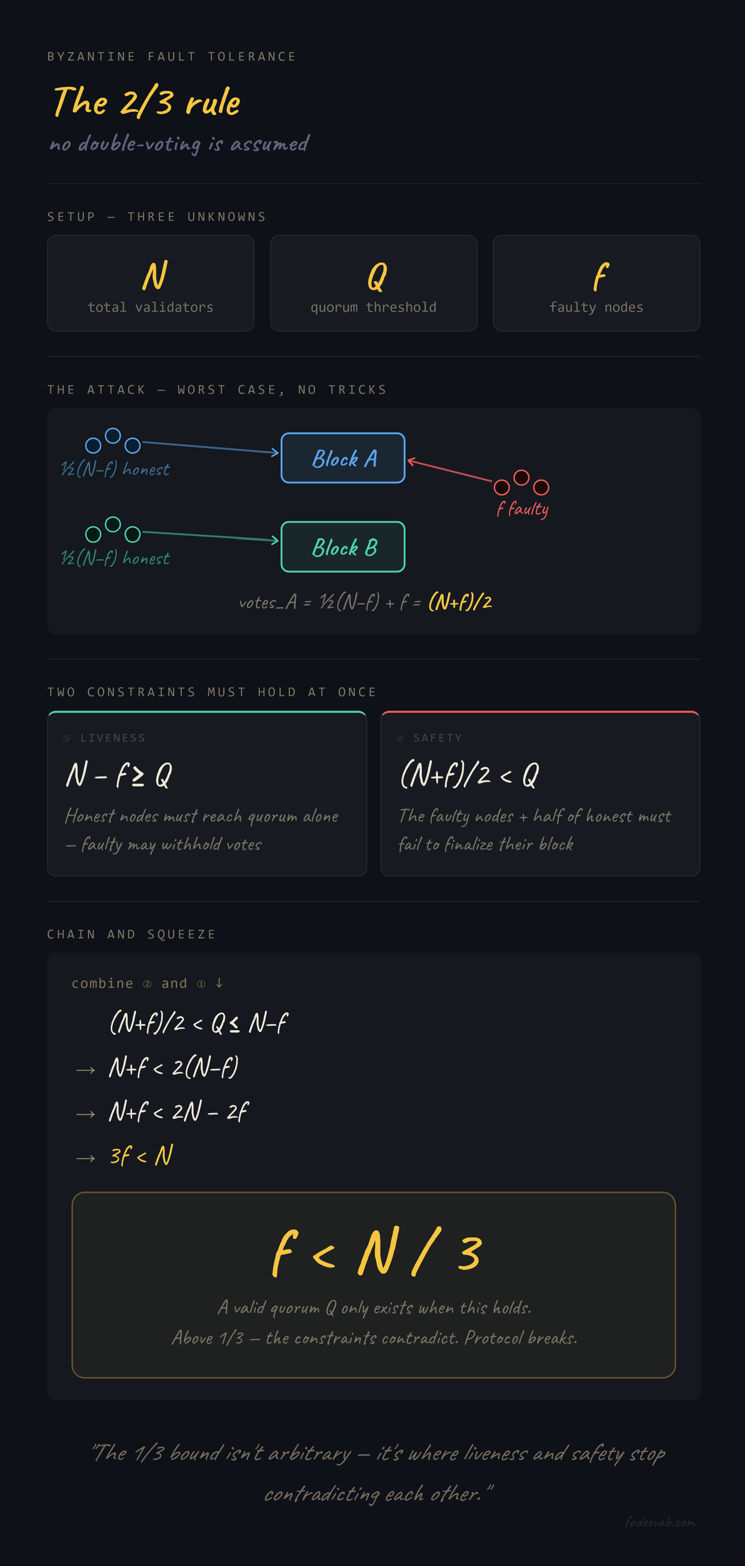 (N-f)/2is less than half of the nodes. - Block A might have enough votes, but only if there are "too many" faulty nodes (more than 1/3).