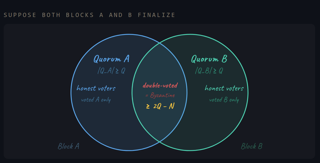 Safety: 2Q-N > f β we need the overlap to contain at least one honest node, so the double-voting FAILS.