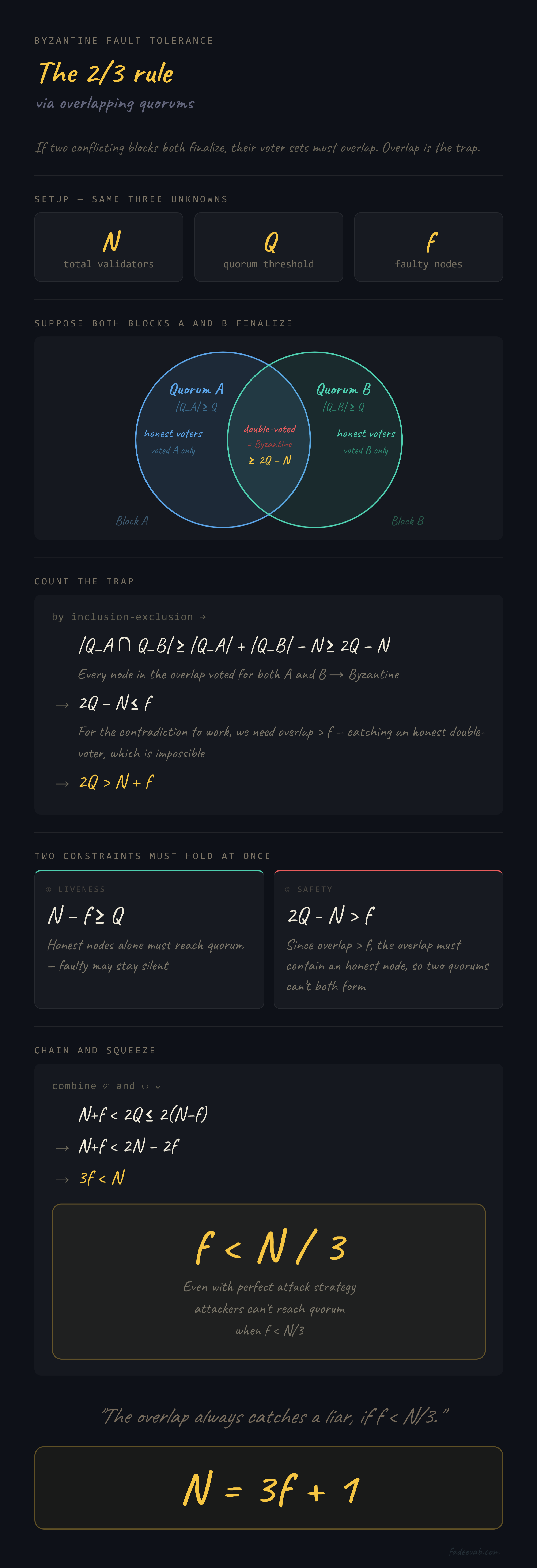 overlap > f, so at least one honest node is in the overlap.And let's go through some calculations: